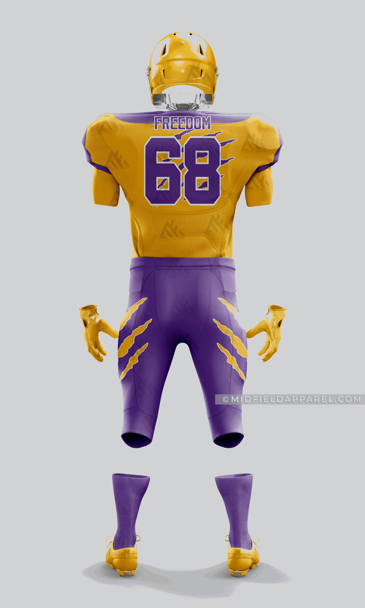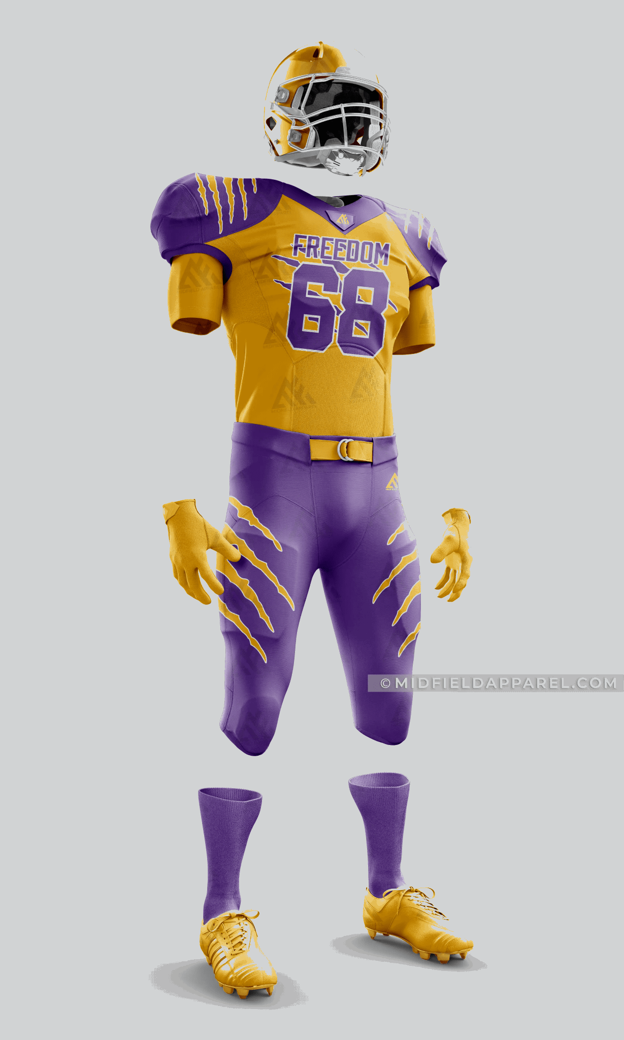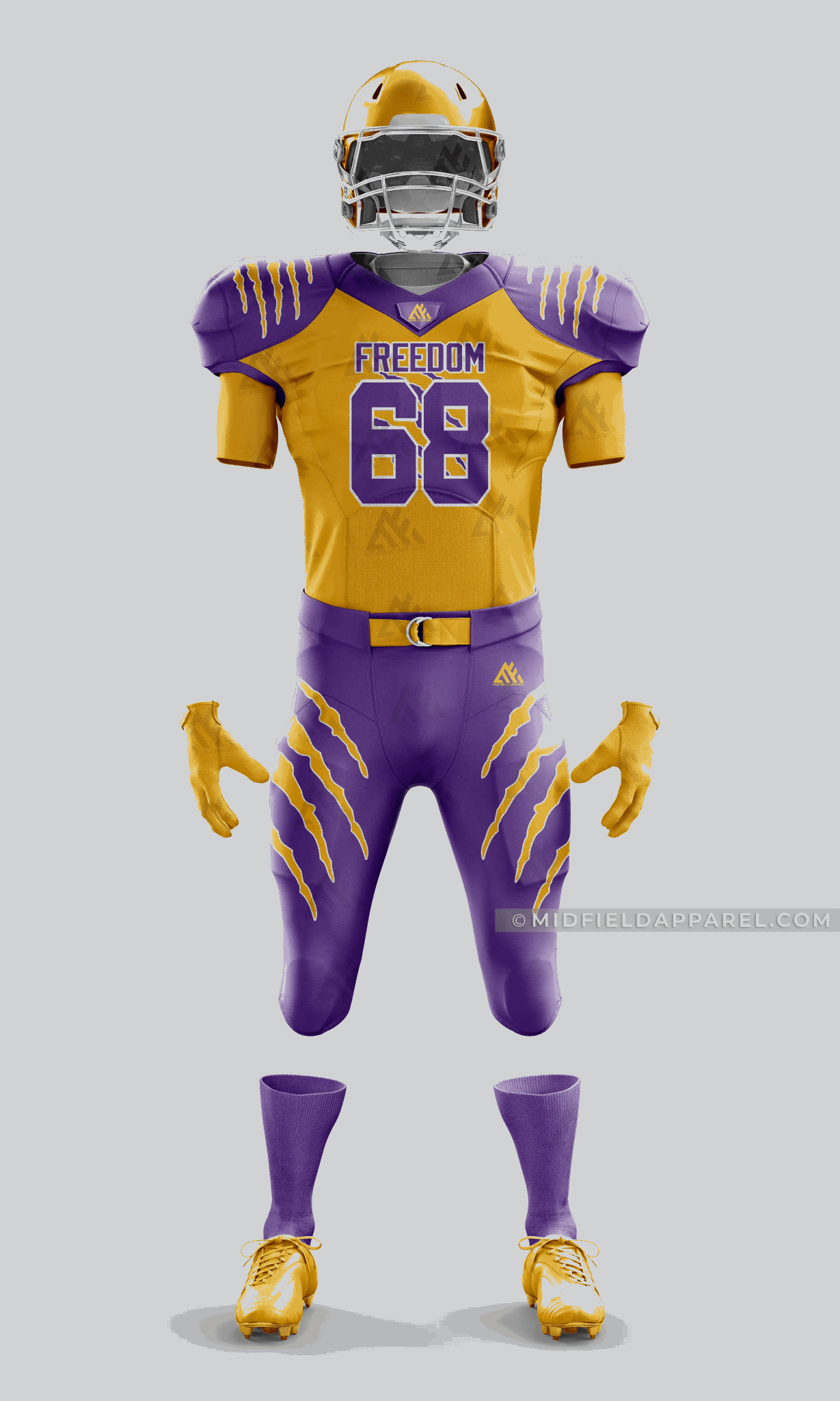 Perfect for youth, adult, high school, and professional leagues, this football uniform is fully customizable with your team logo, colors, names, and numbers. Whether you’re preparing for a big tournament or outfitting your school team, the Freedom Gold & Purple uniform delivers top performance and bold looks.