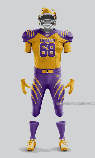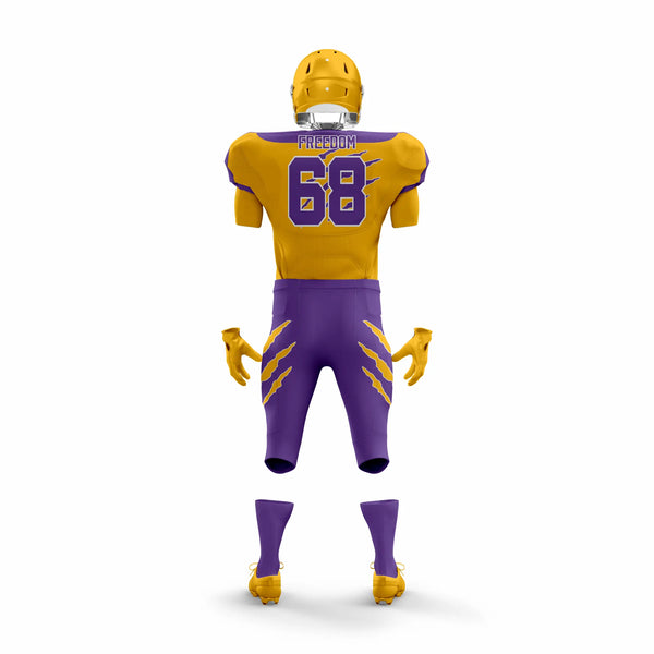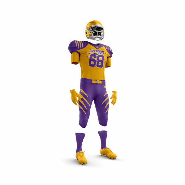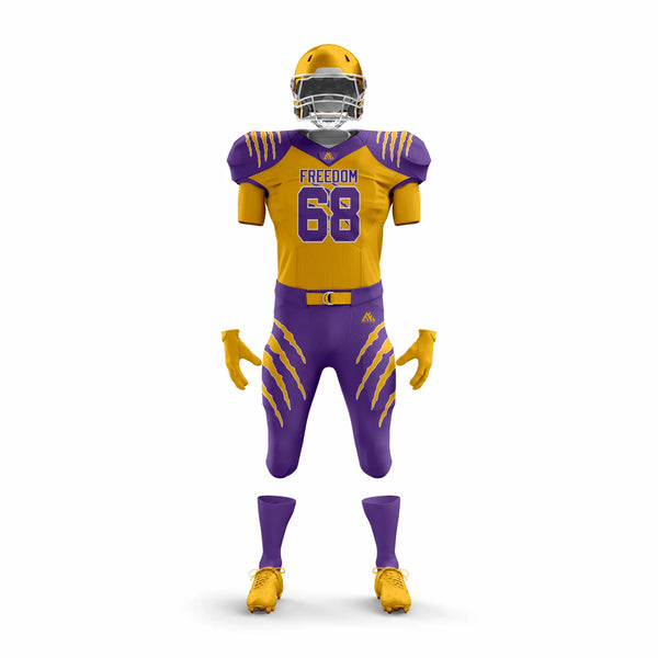 Stand out on the field with the Freedom Gold & Purple American Football Uniform, designed for strength, performance, and unbeatable style. Made from premium moisture-wicking, breathable polyester, this uniform keeps players cool, dry, and comfortable through every play. Reinforced stitching provides long-lasting durability, while the striking gold and purple colorway showcases team pride and confidence.