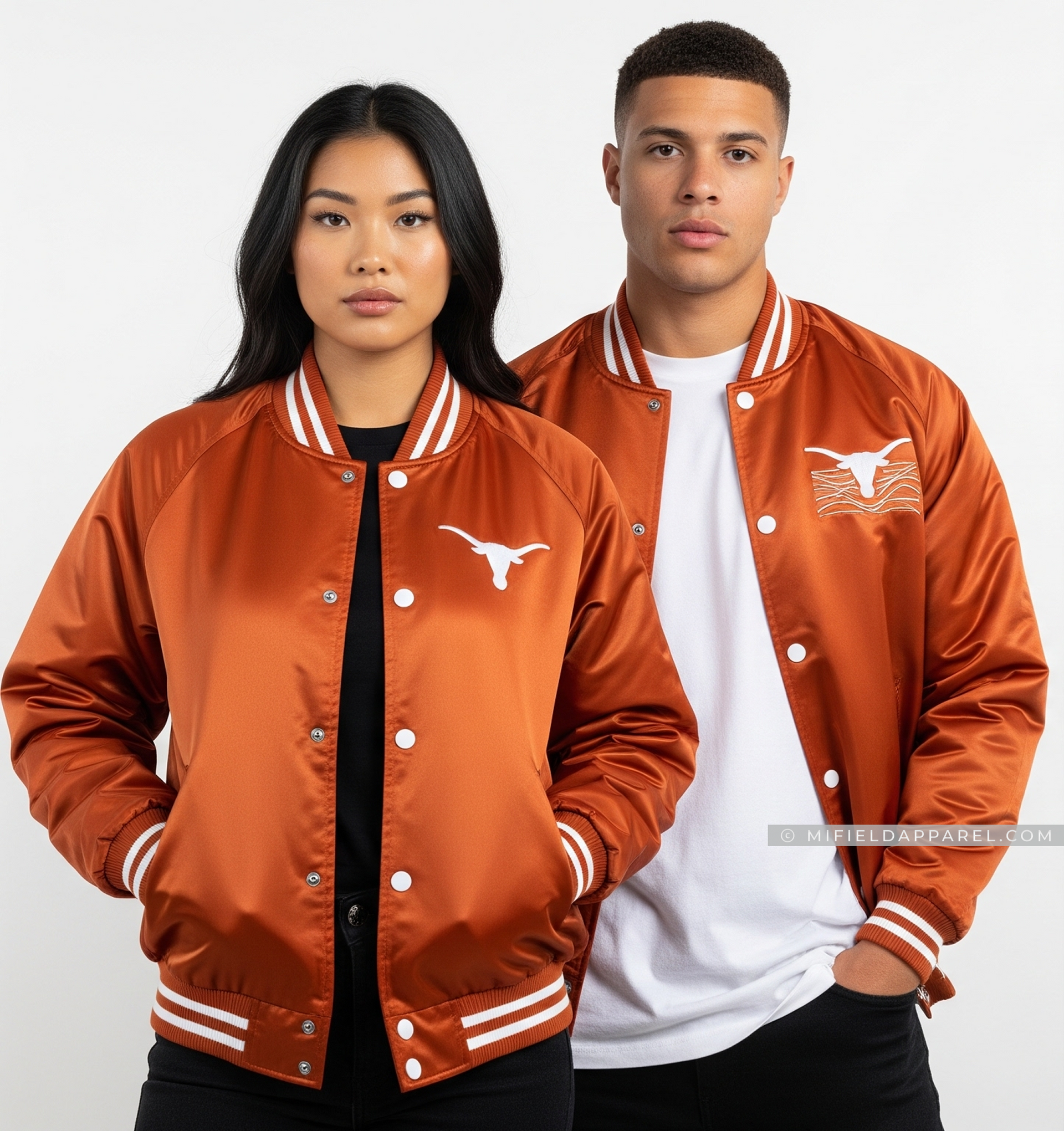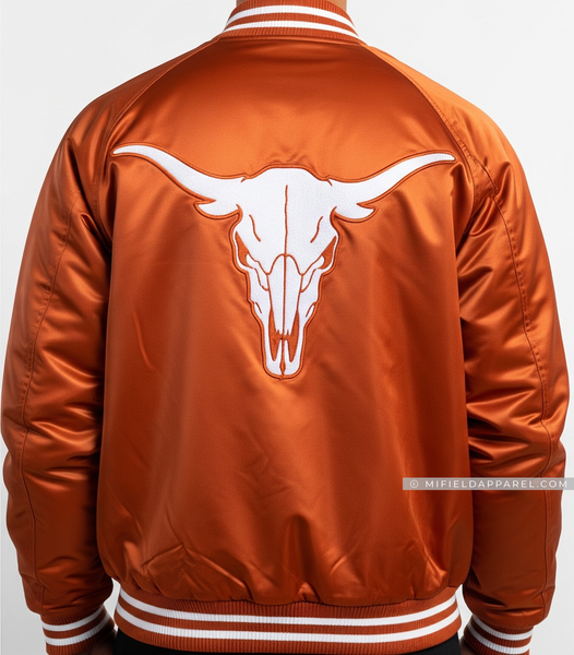 Show your Texas pride with this Longhorns-inspired satin varsity jacket, designed in the iconic burnt orange with crisp white accents. The oversized Longhorn logo embroidery on the back and matching chest patch highlight bold athletic tradition. Made from premium satin for a glossy finish, with ribbed cuffs and hem for comfort and durability, this jacket is perfect for athletes, students, and fans alike. Whether on campus, at games, or on the streets, this custom varsity jacket delivers classic Texas style with modern streetwear appeal.
